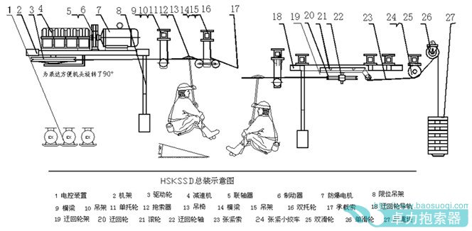 示例:采用機械傳動,電力液壓制動和重錘張緊,最大適用傾角22°,最大運輸距離500m,驅(qū)動功率為30KW的煤礦固定抱索器架空乘人裝置:RJY30-22/500。